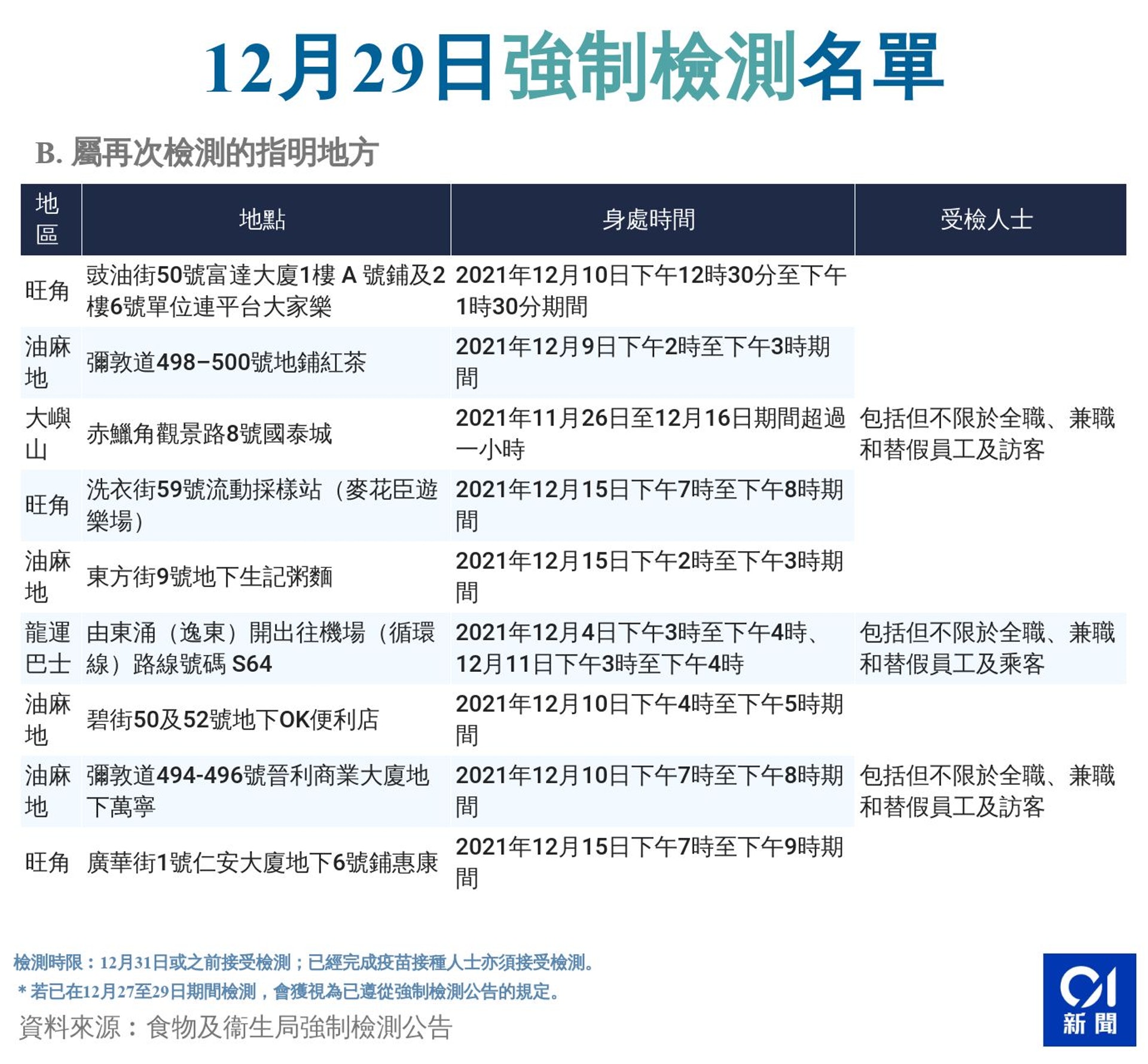 . 涉及的地點大部分位於油尖旺 包括旺角的富達大廈大家樂 麥花臣遊樂場流動採樣站 家樂坊星巴克咖啡 仁安大廈惠康 油麻地的紅茶. 不遵從強制檢測令即屬犯罪並可處罰款25000元及監禁6個月 政府重申發出強制檢測公告的目的是為了盡快堵截2019冠狀病毒病在社區散播以保障整體的公眾衞生安全應受檢人士應在合理可行範圍內採取適當個人防疫措施包括佩戴口罩及保持手部衞生. 政府指 因應早前一宗潛伏期內曾於香港逗留的輸入個案 於指定期間曾身處11個地方的人士 須於星期五或之前再次進行檢測.